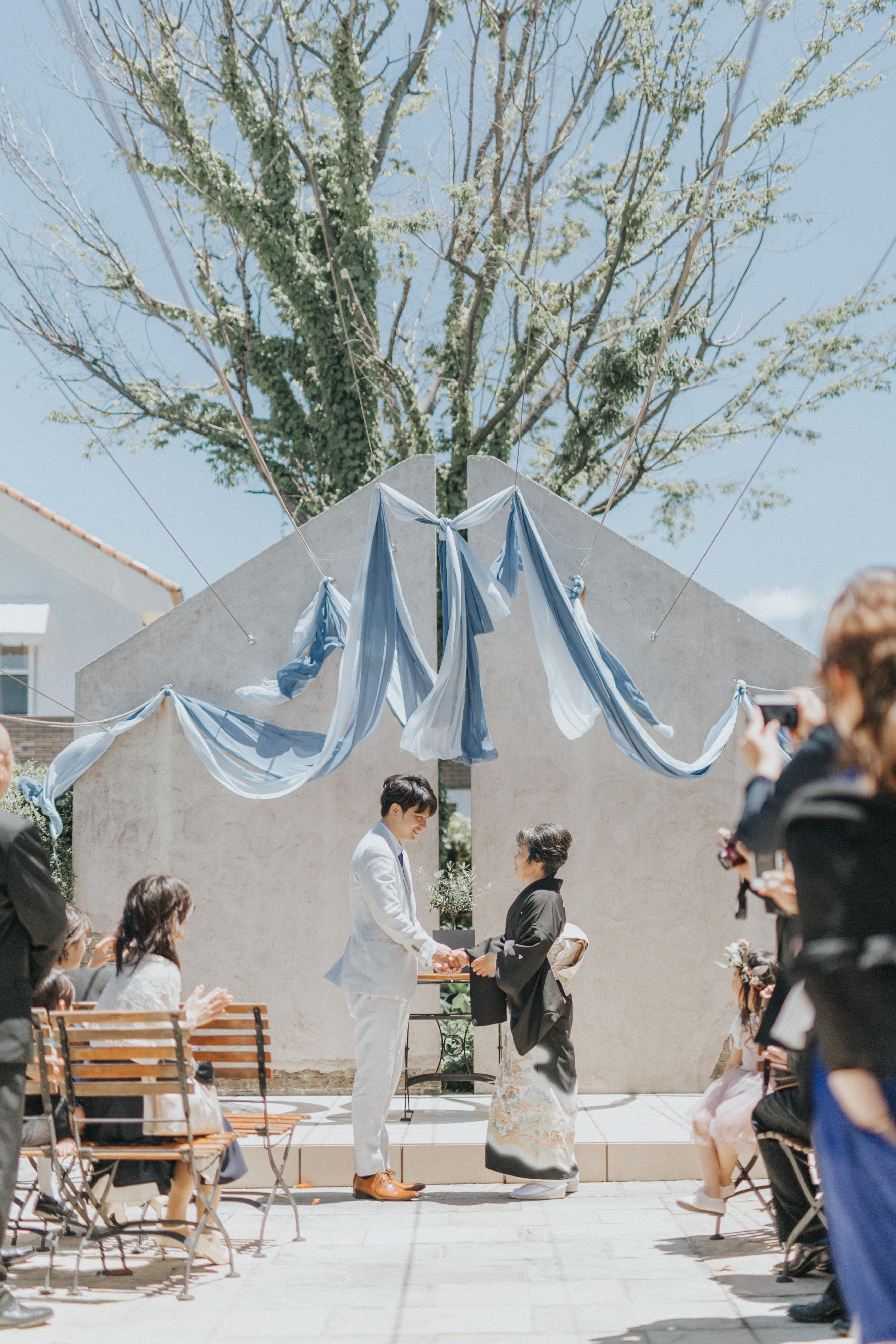 今回はガーデンで着席している方も立っている方もみえるという事で、リボンを使って一列に全員が並ぶ事はスペース的に難しいので、もっと簡単にアットホームに行える方法で演出を行う事になりました。