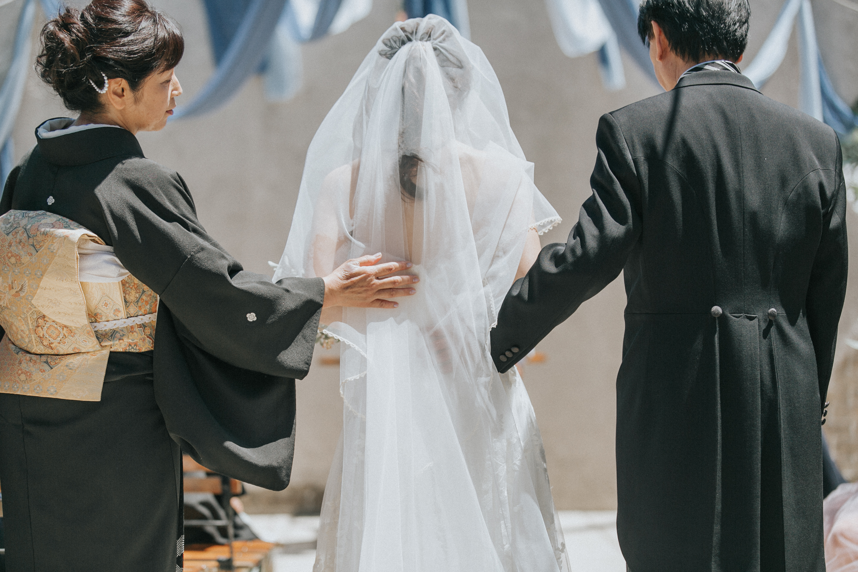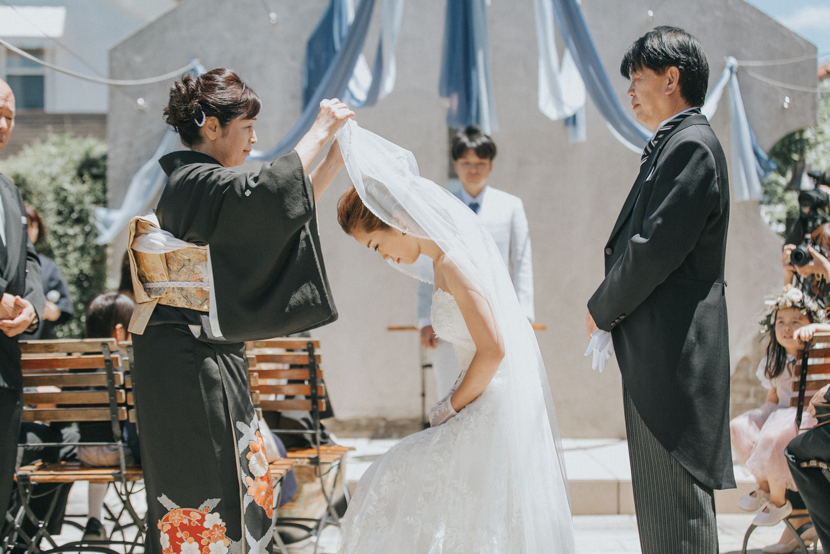 一般的には入場した先にお母さまがスタンバイされてヴェールダウンの儀式をされるケースが多いかと思いますが、あえてバージンロードの中央まで3人で歩いて頂きました。