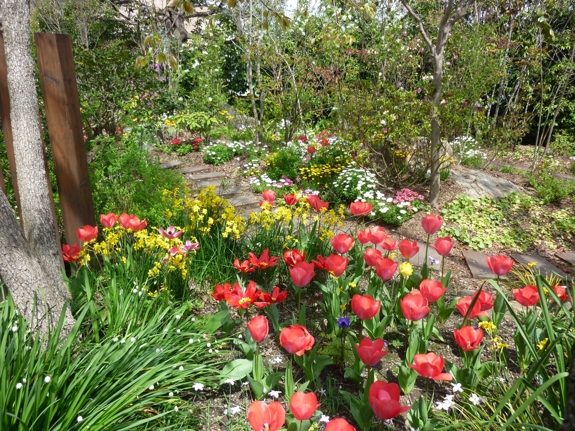 南向きの庭にはしだれ桜が咲き誇り、北側の庭にはチューリップなどが色を添えて華やかさを演出しています。