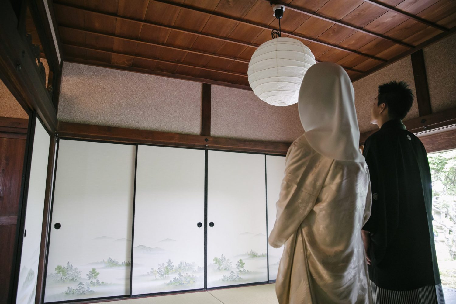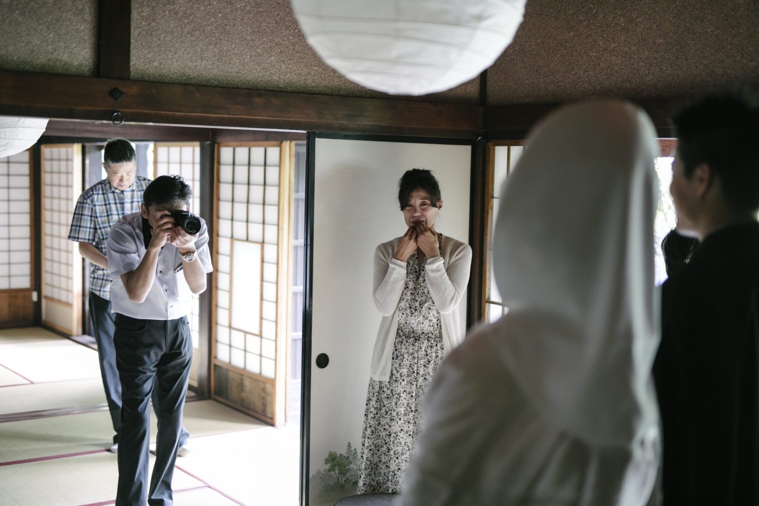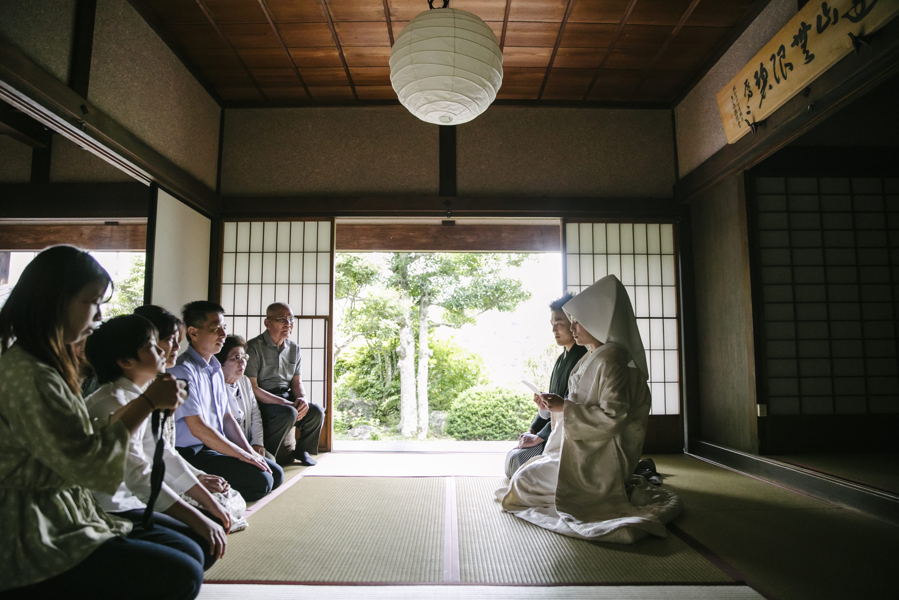 襖を挟んで、新郎新婦と家族が向かい合って準備完了。